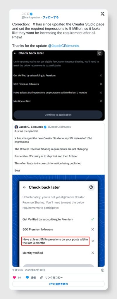 2025年12月9日に拡散した「Xクリエイター収益配分プログラムの要件が500万→1500万インプレッションに引き上げ」という情報について、情報元の@blankspeaker氏本人が12月10日に訂正投稿を行いました。