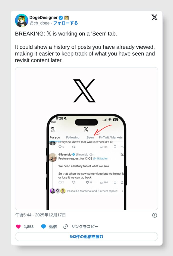 2025年12月17日、X(旧Twitter)が新機能「Seenタブ(閲覧履歴タブ)」のテストを開始していることが明らかになりました。この機能は、タイムラインで閲覧した投稿を自動的に記録し、後から簡単に再訪できるようにするものです。