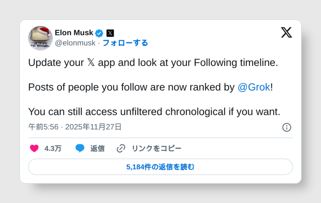 2025年11月27日、Elon Musk氏がXのFollowing(フォロー中)タイムラインがGrok AIによるランキング表示に変更されたことを発表しました。この変更により、従来の時系列表示がデフォルトではなくなり、Grok AIがユーザーの興味・関心に基づいて投稿を並び替えるようになりました。