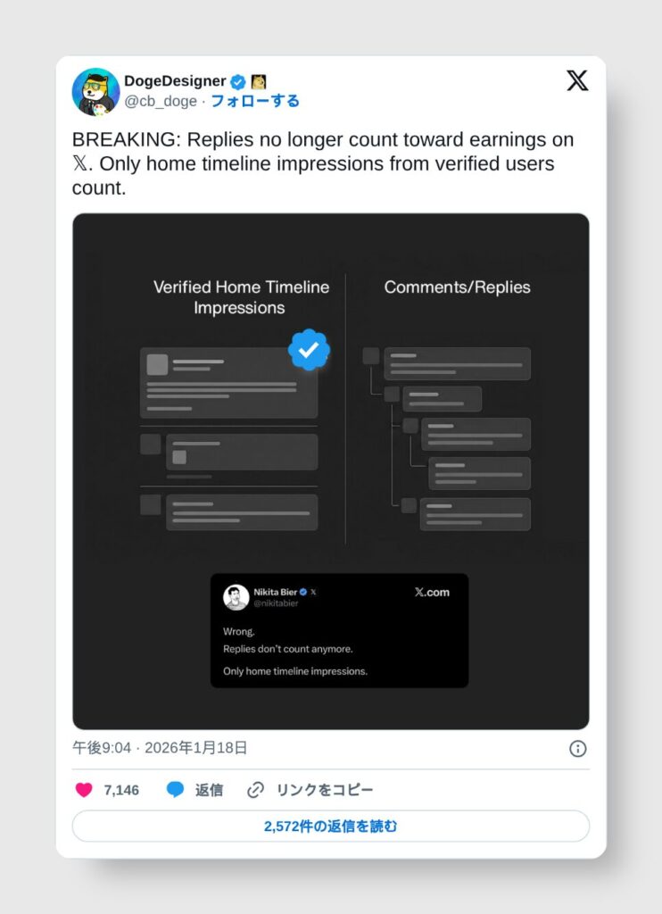 2026年1月18日、@cb_dogeの投稿で「リプライは収益対象外」との情報が拡散されました。しかし、約1時間後に公式から修正が入り、以下の事実が明らかになりました。