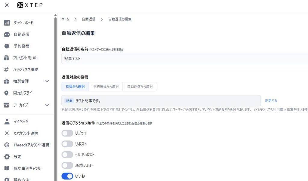 記事内容を編集すると自動返信設定がリセットされるため、編集後に再度XTEP側で設定し直す必要があります。