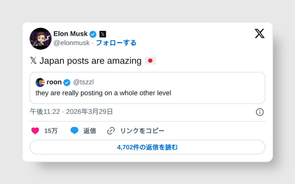 - 3月29日:「 Japan posts are amazing」(日本のX投稿は素晴らしい!)