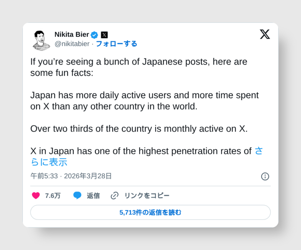 実は日本がXにおいて突出した存在であることは、以前から業界内では知られていました。X製品責任者のNikita Bier氏はこう述べています。